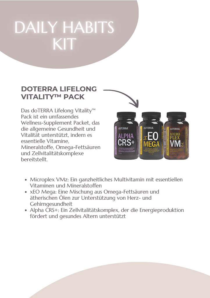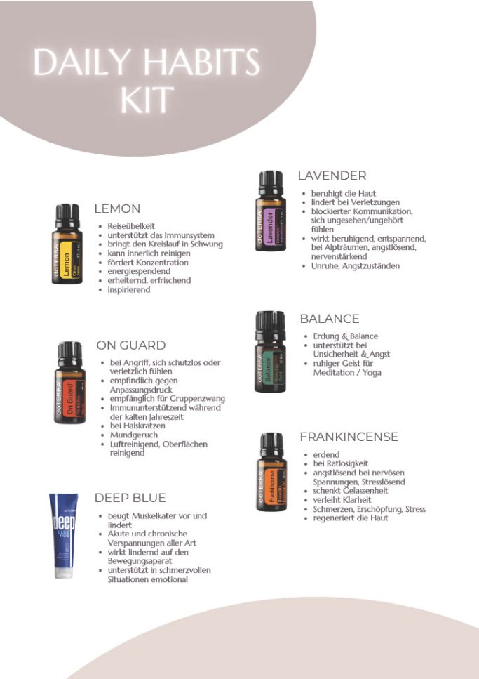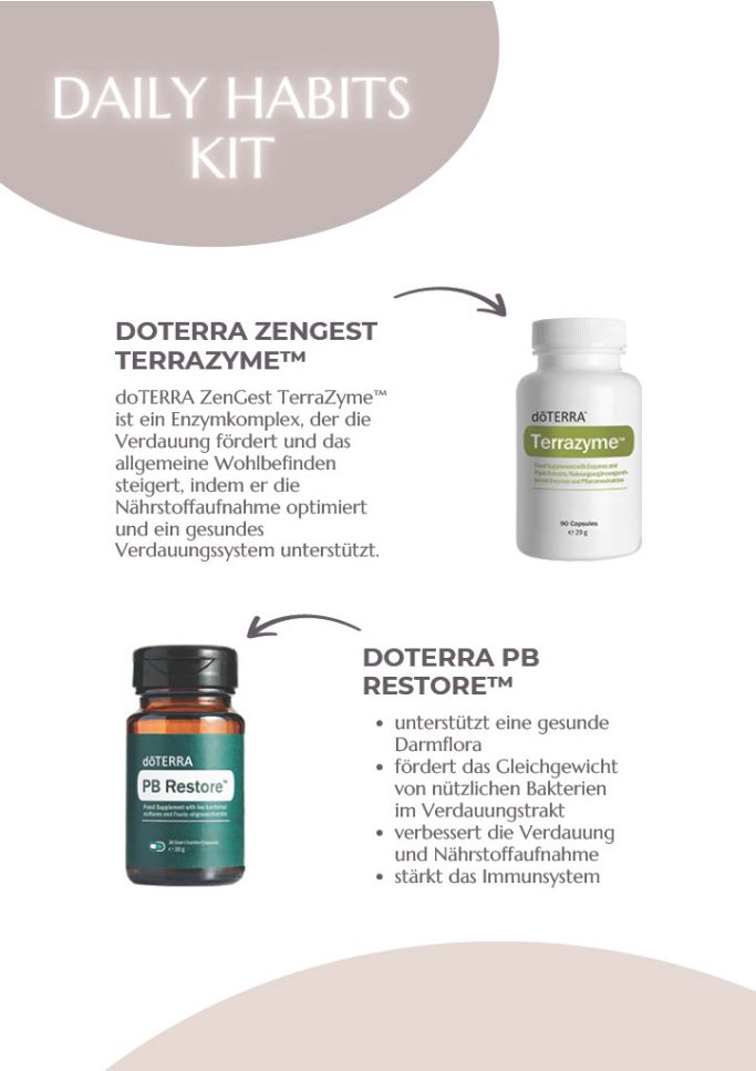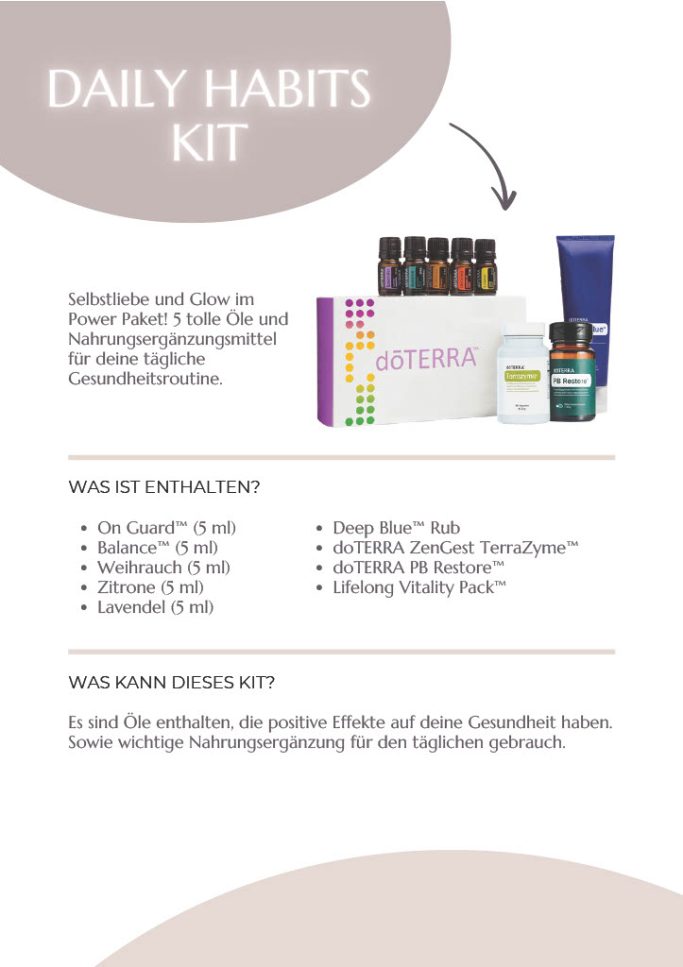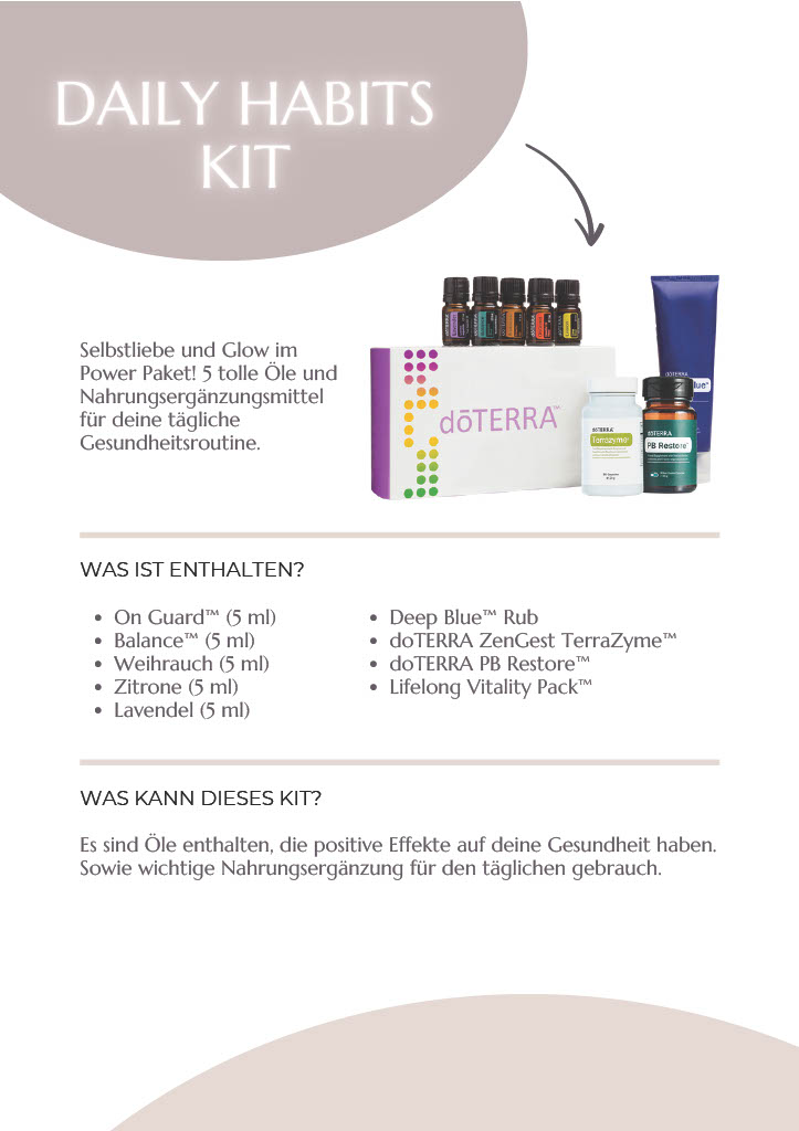 Das Daily Habits Kit ist wie eine tägliche Umarmung für dein Wohlbefinden. Es vereint kraftvolle ätherische Öle und Nahrungsergänzungen, die dich jeden Tag auf körperlicher und emotionaler Ebene stärken. Für mehr Energie, innere Balance und Selbstfürsorge – einfach, natürlich und tief wirksam. Dein Ritual. Dein Reset. Jeden Tag.