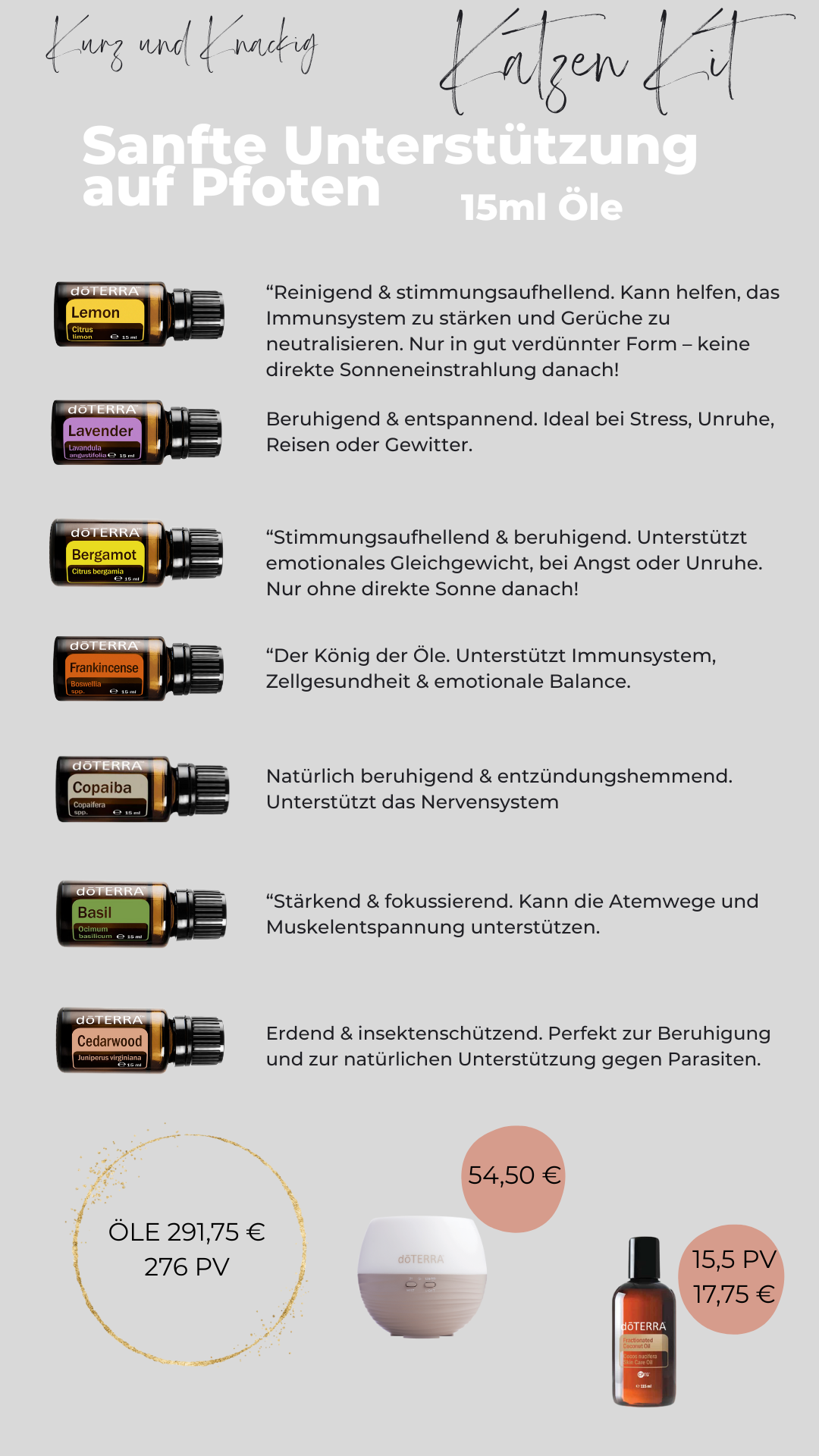 Katzen sind feinfühlige, sehr sensible Wesen – und genauso vorsichtig sollten wir mit ätherischen Ölen umgehen. Weniger ist hier nicht nur mehr, sondern essenziell. Viele Öle sind für Katzen ungeeignet, manche dürfen nur indirekt – z. B. über den Raumduft – eingesetzt werden. Gib deiner Katze stets die Wahl, sich zurückzuziehen, und achte auf jedes feine Signal. Achtsamkeit ist auch hier der schönste Ausdruck von Liebe.