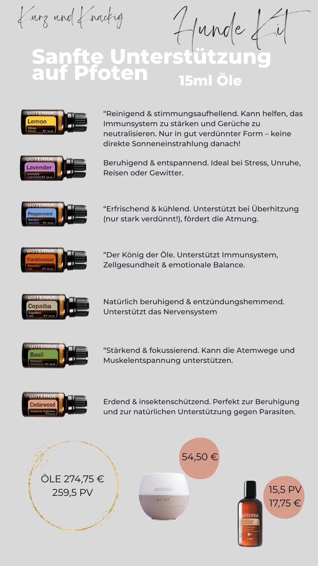Ätherische Öle können auch unsere tierischen Gefährten sanft begleiten – besonders Hunde reagieren oft positiv auf die natürlichen Pflanzenkräfte. Wichtig ist: Weniger ist mehr. Achte auf eine verdünnte, ruhige Anwendung, gib deinem Tier Raum und beobachte es liebevoll. So wird jeder Tropfen zu einer stillen Form der Fürsorge – achtsam, sicher und herzverbunden.