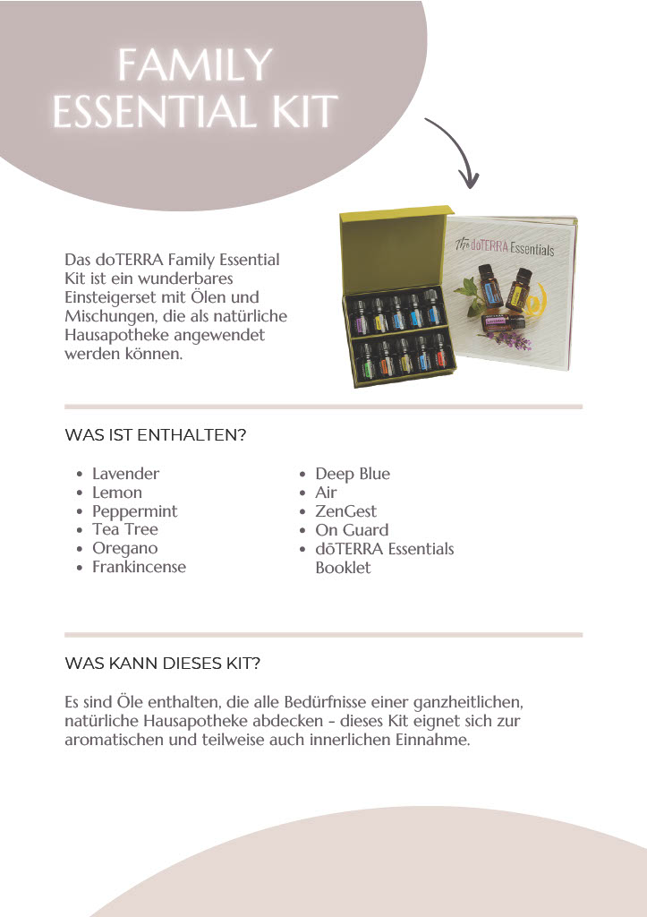 Das Family Essentials Kit ist eine liebevoll zusammengestellte Hausapotheke im Miniformat – perfekt für Familien, die natürliche Lösungen im Alltag schätzen. Zehn ausgewählte doTERRA Öle begleiten euch bei kleinen Wehwehchen, emotionalen Momenten und täglichen Herausforderungen – sanft, sicher und wirksam. Ein Tropfen Nähe. Ein Hauch Natur. Für Groß & Klein. 🌿